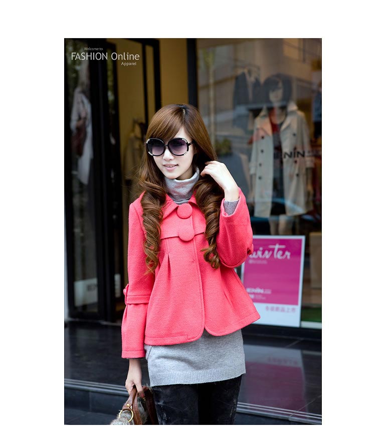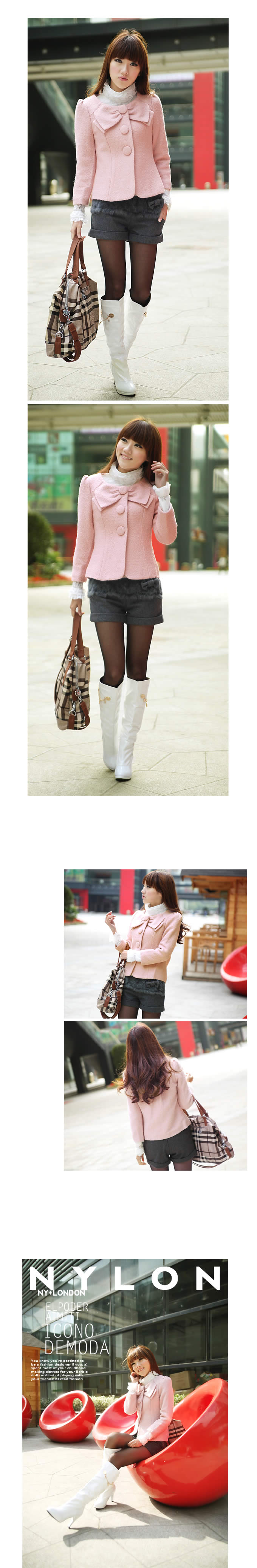 粉色,充满甜美淑女气息的蝴蝶结短外套,九分袖韩风设计 适合优雅白领穿着,小圆领大包扣,蝴蝶结造型的领口,映衬着蕾丝内搭的华美~ 无不透着精致小女人味道~~ 同款黑色,更显气质出众 黑色外套搭配一件稍长的玫红色毛衫、隐约露出可爱的小蝴蝶结图案, 千鸟格短裙、黑色丝袜……性感OL由你打造!